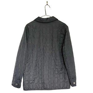 Insulated Coach Jacket with signature logo stitching, lightweight but very warm. Perfect for traveling when you need a jacket but you don't want to wear a bulky coat. Color: Grey with lavender lining Size: Medium Length: 28" from top of the back to bottom Includes original garment bag