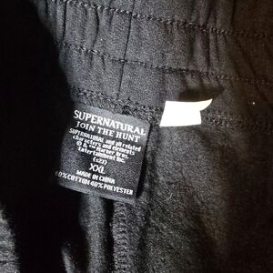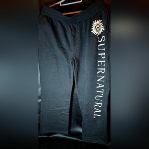 Stylish black pants with 'Supernatural' graphic text. Perfect for casual wear.