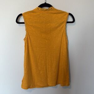 This is a mustard yellow colored sleeveless tank top by Lucky Brand in a size women’s small in excellent condition, had a embroidered floral detailing at the top of the tank with buttons as pictured. Also around the neck line and arm pits.