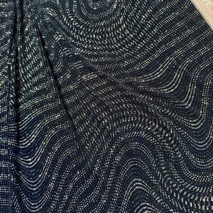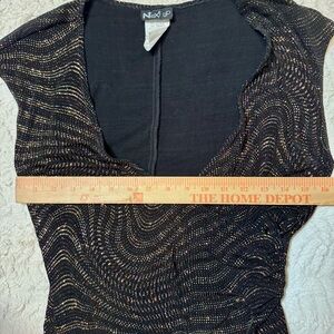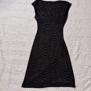 Stunning black cocktail midi dress featuring a gold glitter wavy pattern throughout. Flattering V-neckline, short sleeves, and an A-line silhouette that drapes beautifully. The fabric has a decent amount of stretch, making it super comfortable while still looking glam.