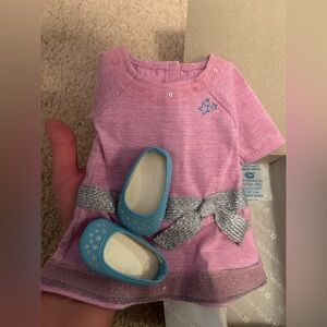 Basket Includes “Doll Travel”supplies book and kit girls can use to create make-believe theme parks, sandy beaches, and charming cruises. Includes a real doll-sized duffel bag, an idea book, and travel essentials: a pretend passport, mini international maps, faux airline tickets, and souvenirs. “Doll Work”book and kit to learn how your doll can start a business or just serve her community. Includes lots of supplies to make each task even more fun. Wellie Wishers Tea for Two Part Set includes an adorable yellow teapot in the shape of an owl, plus playfully mismatched place settings: two plates, two cups and saucers, two Forks and spoons, two folded napkins, and two colorful placemats. Lilac Dress boxed outfit, Lovely Leopard Pajama boxed outfit and Pretty Pink TuTu boxed outfit. Also includes Print Tank Top and 3 in 1 ring set.