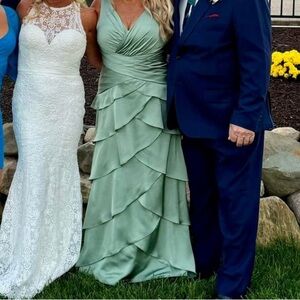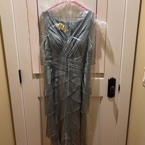 Sophisticated gray dress with an asymmetrical design. Perfect for weddings and formal events. Flattering fit with stylish draping.