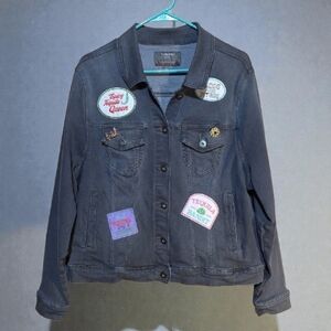 Upcycled gray Torrid denim jacket featuring a colorful taco graphic and fun patches. Perfect for casual outings.