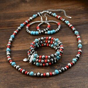 4 PCS Western Turquoise Jewelry for Women Boho Vintage Navajo Pearl Necklace Ear