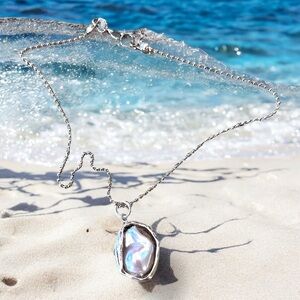 Baroque faux pearl in silver plated alloy shell on a dainty ball bead chain closed with a lobster clasp. Choker 16” This exquisite necklace showcases a sleek silver toned ball chain adorned with shimmering baroque faux pearl in silver plated alloy shell. Choker 16” The pendant exudes a subtle iridescent glow. The minimalist design features polished alloy and delicate oval-shell shaped element, creating a fun beach summer look. Perfect for adding a touch summer to any outfit.