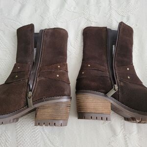 Real suede leather short heeled bootie with studded harness style details. Chocolate brown color. Zipper closure on shaft. Chunky heel, thick tread for winter. Very little wear on tread and heel. Light wear on suede.