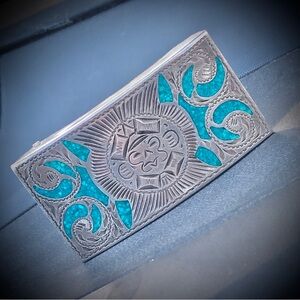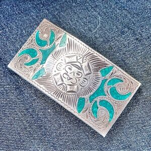 Vintage Sterling Silver Turquoise Aztec Mayan Belt Buckle Mexico