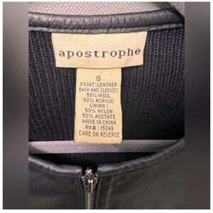 This pre-owned Apostrophe jacket in size Small offers a stylish blend of textures and classic Y2K vibes. The front is crafted from smooth leather, while the back and sleeves feature a 50/50 wool and acrylic blend for warmth and comfort. The jacket is fully lined with a 50/50 nylon and acetate mix and closes with a full-length zipper for a sleek, polished look. Despite normal signs of wear and minor creasing, the jacket is in great overall condition with no visible flaws. Perfect for casual outings, layering over outfits, or adding a vintage touch to your wardrobe.