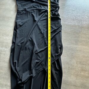 Chic one shoulder design. Perfect for evening events. Sleek and stylish. Sorry for the pics/ so hard to photograph black. The front is short length and then goes long in the back!