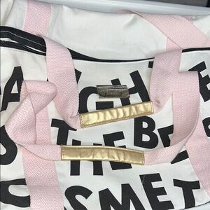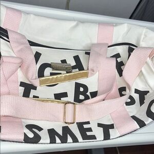 This eye-catching travel bag from Benefit combines a playful pink and black color scheme with a bold, brush-stroke text design. Crafted from a soft, flexible material, it offers ample space for your beauty essentials while adding a touch of fun to your daily routine.