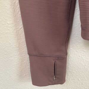 Spandex zip up workout jacket with thumb holes. Lightweight coverage great for jogging, hiking, general outdoor activities. Color is a mauve brown.