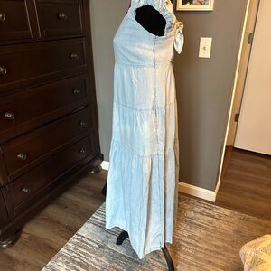 Chic light blue denim midi dress with puff sleeves. Ideal for casual outings.