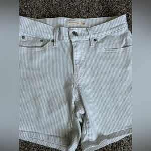 Levi Strauss women’s mid-length white denim with light blue pinstripe shorts. Waist: 14.5” Rise: 9” Inseam: 6” Clean and good condition
