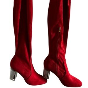 Step out in style with these vibrant red suede boots. Featuring a chic clear heel, these boots are perfect for making a bold fashion statement.