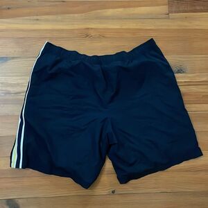 Blue 100% polyester, pull-on shorts with contrasting yellow, ribbed side panels by Lacoste Sport in a men's size 4XL. Elastic waist with drawstring. Side pockets. Line with a white, cotton-poly, jersey knit fabric. Green crocodile transfer logo on right thigh. Machine washable. Approximate measurements shown in photos. In great pre-owned condition and may have minor signs of wear from light use.