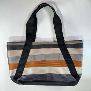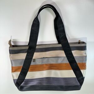 harveys tote, seatbelt bag, striped tote bag, large carryall bag, sustainable fashion bag, recycled material tote, everyday travel tote, work tote shoulder bag, neutral stripe bag, multicolor stripe tote, durable tote bag, commuter shoulder tote, eco friendly handbag, washable tote bag, structured travel tote, large shoulder bag, seatbelt webbing bag, modern casual bag, weekender style tote, versatile neutral bag, boho stripe tote, gray stripe tote