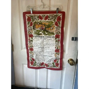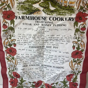 This vintage Irish tea towel features a colorful all-over linen blend material with a farmhouse style recipe for Hot Pot Pudding. The towel is perfect for collectors of antique kitchen linens and textiles. It is iron safe and washable, making it a durable addition to any kitchen. The towel is an original piece from the Sunday brand and is sure to add a touch of charm to any adult kitchen.