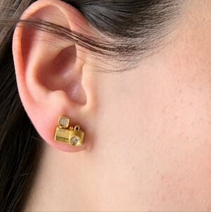 Elegant gold camera-themed necklace and earrings by Kate Spade. Features sparkling accents.
