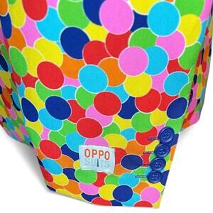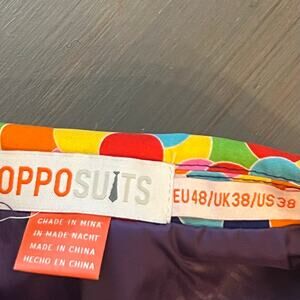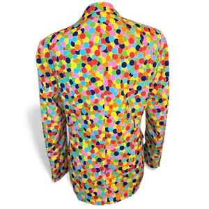 Jacket: 2-Button front, 4 Inside pockets, 4-Button cuff, Double vented back, Front flap pockets, Fully lined, Left chest pocket, Notch lapels, Padded Shoulders, Regular length. Featuring a multi color fun confetti print, sure to make a statement at the party! Excellent condition.