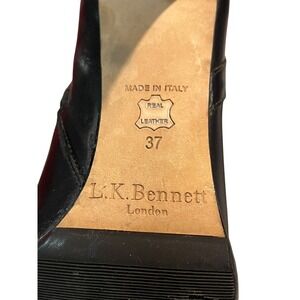 These LK Bennett Dark Brown Leather Knee High Zip Up Elasticated Riding Boots in EU37 are a stylish and versatile addition to any woman's wardrobe. With an almond toe shape, high heel, and knee-high shaft, these boots are perfect for a variety of occasions including travel, formal events, and casual outings. Made from luxurious leather with a comfortable leather lining, these boots offer both elegance and practicality. The dark brown color and equestrian theme add a touch of sophistication to any outfit, making them a must-have for the fashion-forward woman. Made in Italy, these boots are not only high-quality but also a timeless classic.