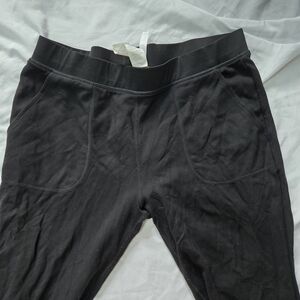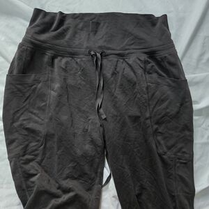 Dark grey/light black tie drawstring waist with loose jogger cuffs, 2 front pockets. Approx. 13" waist, 19" hips, 9" rise, 25" inseam