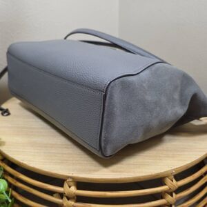 Color / Material: Grey polished pebble leather with suede sides; gunmetal-tone hardware