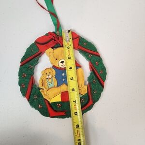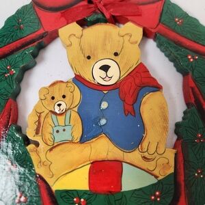 Vintage 1990s Wood Bears Chriatmas Wreath Decoration Hanging Wall Art Lacquered