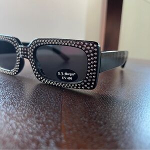 Black rhinestone sunglasses by AJ Morgan from ASOS. Rectangular frame, rhinestone covered finish, high quality injection mold plastics and metals, dark tinted lenses, impact resistant lenses, unisex. UV400 Lens Protection.