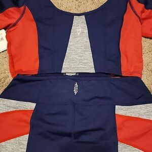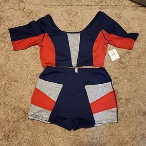Color-blocked two piece is featured in body-hugging design with a moisture-wicking cropped top and shorts.