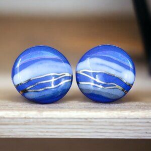 These beautiful ceramic circle earrings feature dreamy shades of blue with soft white swirls and delicate gold accents, a design that resembles an open sky with sunlight breaking through.