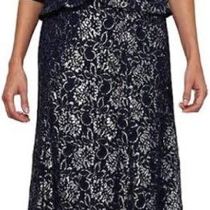 Le Bos Navy Silver Metallic Lace Peplum Long Gown 3/4 Sleeve NWT