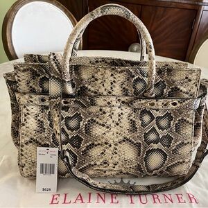 Stylish leather satchel with a bold snake print. Perfect for adding flair to any outfit. The bag is 17” wide and 7” deep strap is 17” and the crossbody strap is 32”