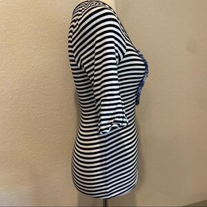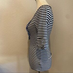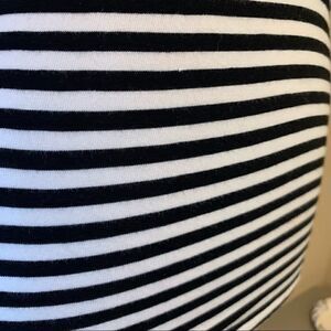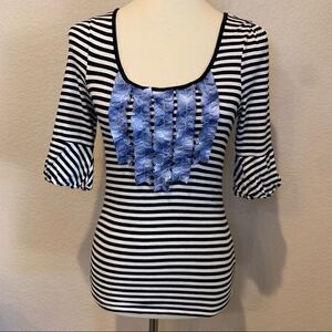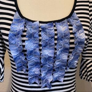 Super cute and unique black & white striped knit top with blue plaid ruffle bib. 3/4 sleeves gathered at shoulder and puff detail at hem. Stretchy & comfortable but still stylish. In great used condition, see pics. Tiny bit of fluffiness to fabric. Photos are a part of the description. Color may vary with lighting or device.