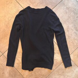 Beautiful pure cashmere sweater in classic black with a unique asymmetrical zip front, ribbed neckline, and a soft, lightweight luxe feel. A few small holes and pilling throughout (shown) but they are subtle when worn over a black layer and the piece still wears beautifully — priced correctly for condition. Cozy, minimal, and perfect for elevated basics. Smoke-free home. Fast shipping. Measurements available on request.