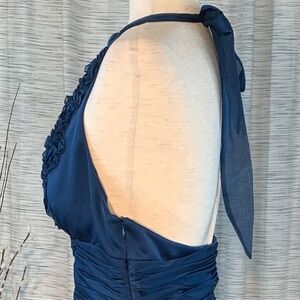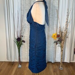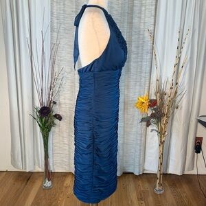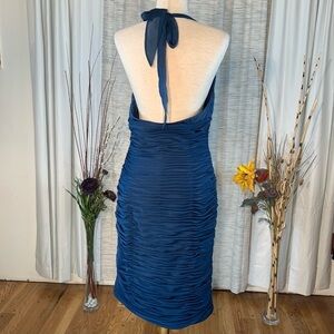 Adrianna Papell solid blue gathered halter styled evening party dress.