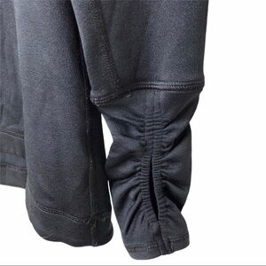 Features: long sleeve, fitted, gathered ruched cuffs with thumb holes, ruching and gathering at shoulders, internal drawcord on neck to cinch tighter, athleisure, athletic, activewear