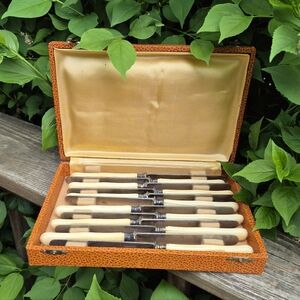 Mathieu Paris vintage knives. I purchased these at an antique market in Paris, France. They are quite old and definitely show signs of age. There are too many flaws to mention them all but examples are cracks, stains, scratches and the box has a vintage smell.
