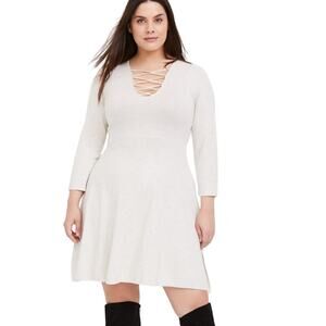 Oatmeal heather skater dress with cross-front detail. Size Torrid 00 which is a medium based on the Torrid size chart. Long sleeves.