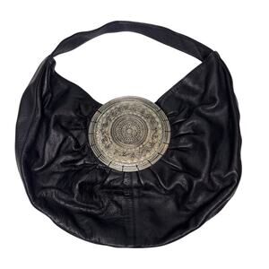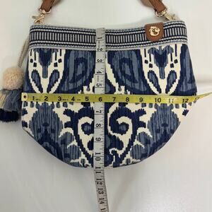 Spartina 449 Moonglade Boho Canvas Ikat Bucket Bag has a canvas detachable strap and a pom pom tassel. It closes with a magnetic snap.