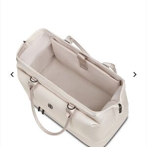 Elegant cream duffel bag by SwissGear. Includes dual handles and adjustable shoulder strap.
