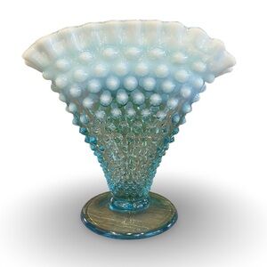 This is a vintage Fenton blue opalescent hobnail fan vase.
