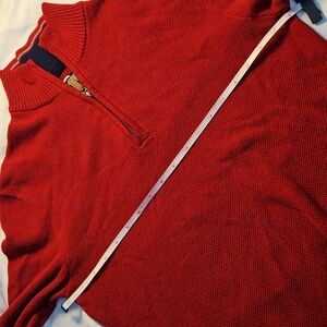 This men's bright red quarter-zip mock neck sweater is a versatile and stylish wardrobe staple, perfect for layering or wearing on its own. It features a classic knit design with ribbed trim on the collar, cuffs, and hem. Faux leather zipper pull for a touch of sophistication. Crafted from a comfortable 100% cotton fabric, this machine-washable sweater is designed for soft comfort and easy care. The vibrant color makes it an excellent option for various seasons and occasions. This NWT item offers a standard fit and is a must-have for any stylish individual's collection.