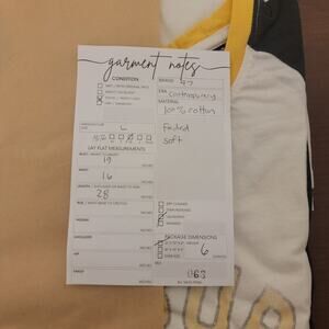 Close-up of garment tags and measurements in photos.