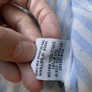 Chic shirt with blue and white stripes. Adorned with colorful floral designs. Super soft. Worn with some piling- see pictures.