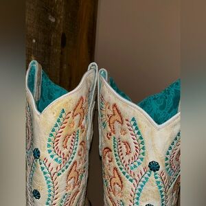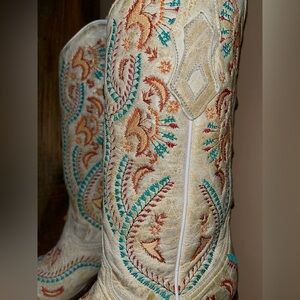 Elevate your look with these elegant embroidered heeled boots. The cream base is beautifully accented with vibrant multicolor embroidery, making them a standout addition to any wardrobe. Worn once, no noticeable signs of wear.