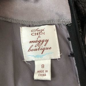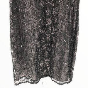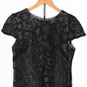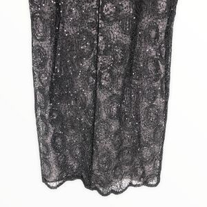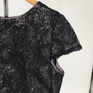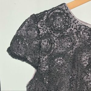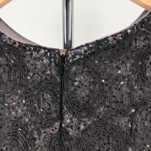 Beautiful cocktail dress, perfect for a wedding, work event, or party. Cap sleeves, sheer black mesh layer with black corded swirls and sequin detailing, solid grey lining, hidden back zip with hook and eye closure.