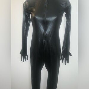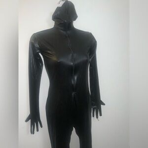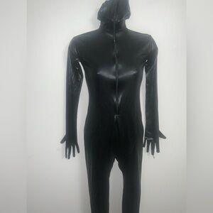 Sleek black full-body catsuit. Perfect for costumes or performances. Zips up in front and covers full body, including head and face. Kinky indeed! Unsure of material, but it has a pleather-esque look to it. In excellent condition will no apparent flaws.
