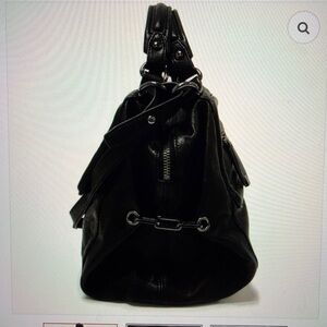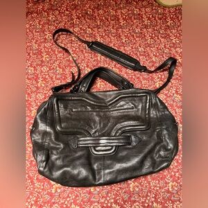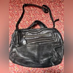 Stylish and durable black leather satchel, from the early 2000's. Leather is in beautiful condition. Shiny gunmetal hardware. Purple twill interior, condition really nice, a little discoloration in one spot, see photo.