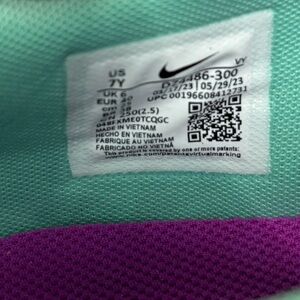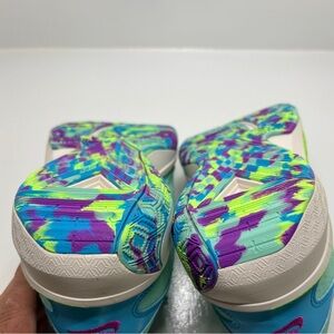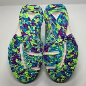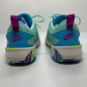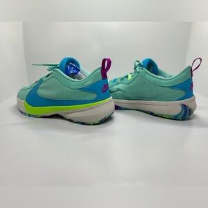 Nike Zoom Freak 5 (GS) basketball shoes in Emerald Rise / Blue Lightning. Youth size 7Y (fits women’s approx. 8.5). Lightweight performance sneakers designed for speed, traction, and stability on the court. Features Zoom cushioning, supportive fit, and eye-catching multicolor outsole.