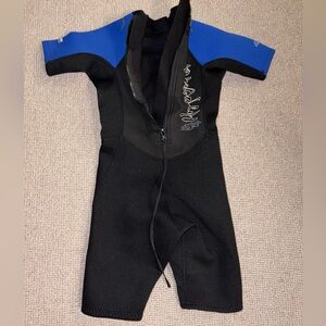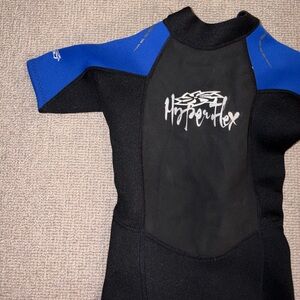 Black and blue one-piece wetsuit from Hyperflex (kids size 6). Pre-loved in great condition with no flaws. Designed with short sleeves and short legs plus a back zipper for easy wear — perfect for warm-water activities. 🌊💙